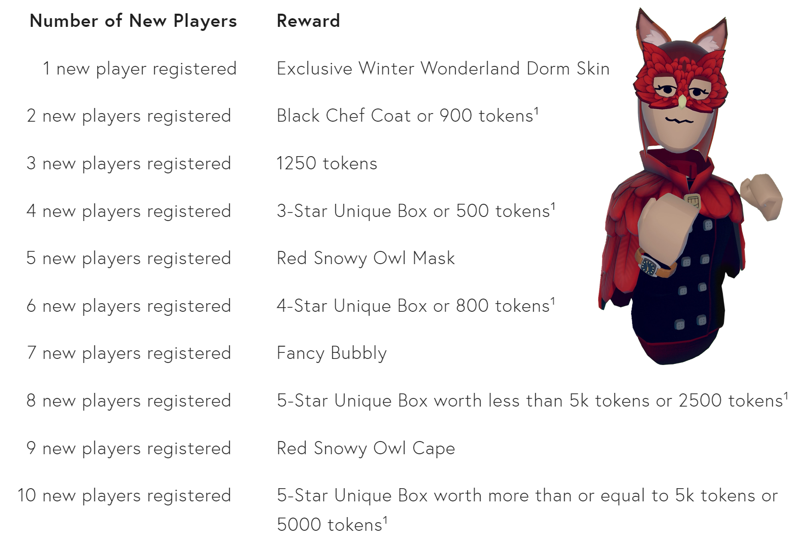 In addition to the initial Vacation Gift, you can as well get even more rewards for inviting multiple players, including the new Ruby Snowy Owl outfit! With all these holiday bonuses you can stop upward with items valuing up to 25,000 tokens when ten of your friends join!